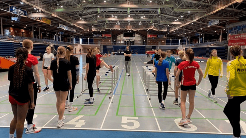 Und dies geschah in den vier Stunden überall in der großen Halle. Auf den Laufbahnen schulten Thomas Prange (Paderborn) und Patrick Nikel (Harsewinkel) Schnelligkeit und Mittelstrecke, für Steffen Biermann (Bünde) und Alexander Sczyrba (Gütersloh) ging es beim Hoch- und Stabhochsprung in die Höhe, für Tapio Linnemöller (Minden) und Klaus Brand (Detmold) in der Sandgrube um die Weite, Andre Meyer (Paderborn) bereitete den Wurf- und Stoßbereich vor, und Adrian Schürmann (Minden) den schnellen Lauf über die Hürden.