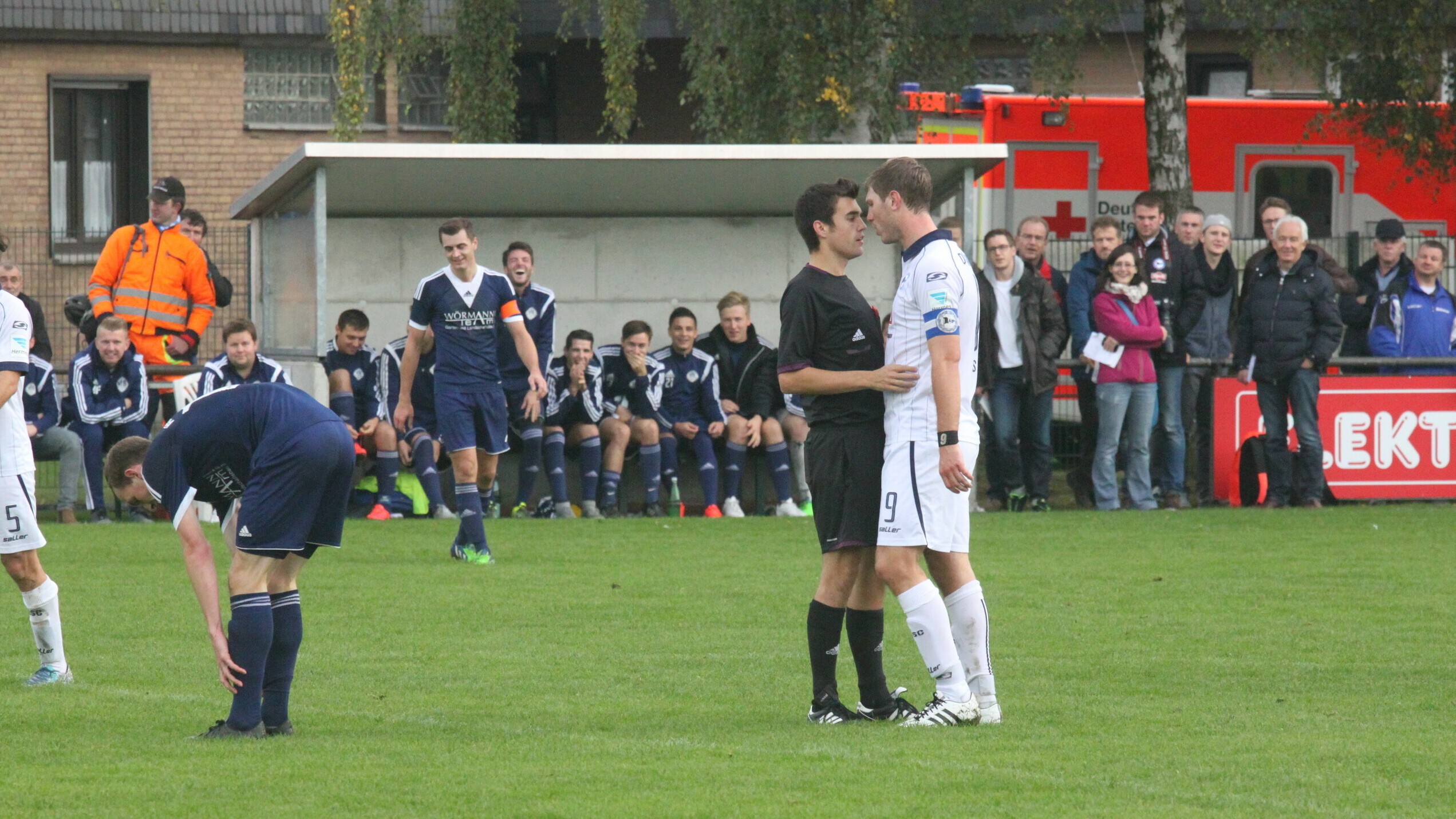 Auge in Auge mit Fabian Klos: Pascal Pooch nimmt sich den Kapitän des DSC Arminia Bielefeld zur Brust. Das 10:1 des DSC am Freitagabend in Schloß Holte war das letzte Spiel für den Unparteiischen von TuRa Heiden.